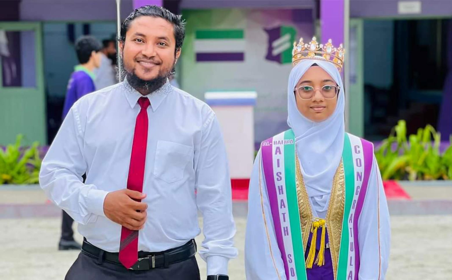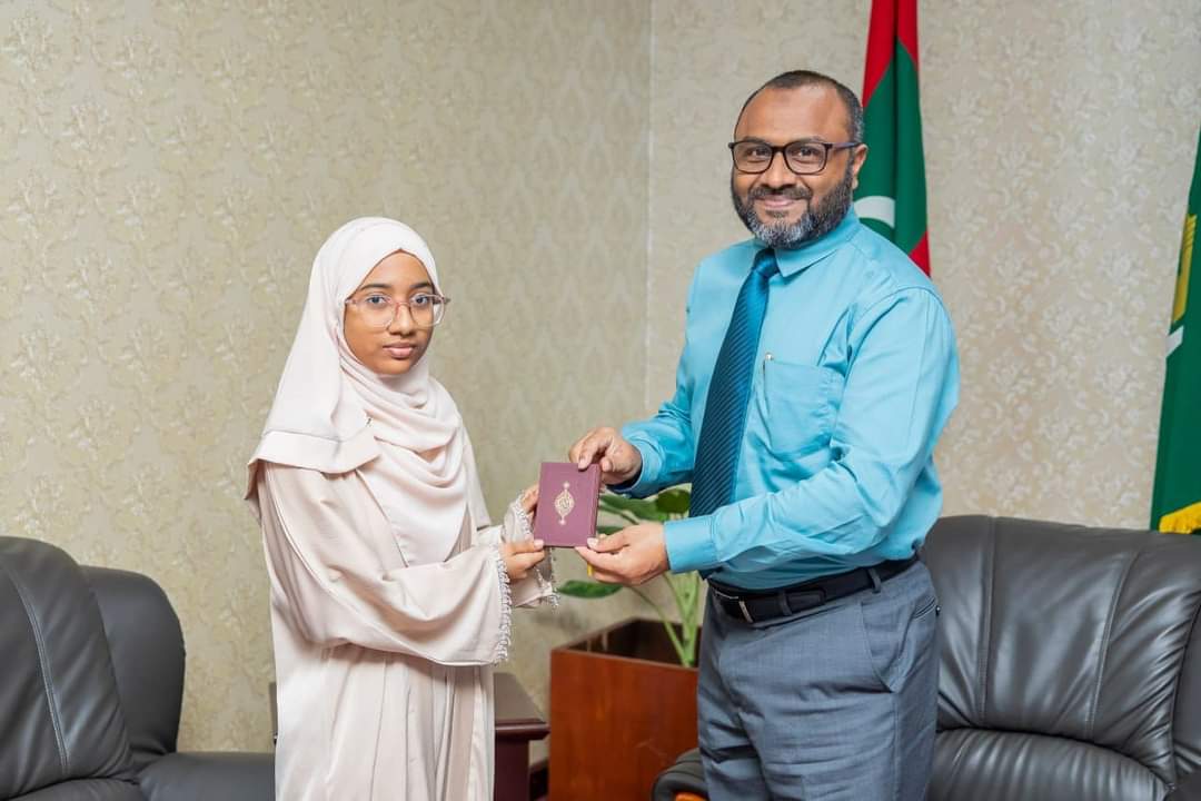 ދެ އަހަރުން ޤުރުއާން ހިތުދަސްކޮށް ހާފިޒާ ކަމުގެ ސަނަދު ހޯދި މަދްރަސަތުލް އިފްތިތާޙްގެ ގްރޭޑު 10ގެ ދަރިވަރު ޢާއިޝަތު ޞާއިބަތު މުޙައްމަދު ރިކްޒާންއަށް އެ ސްކޫލުން ހޫނު މަރުޙަބާއެއް ކިޔައިފިއެވެ.