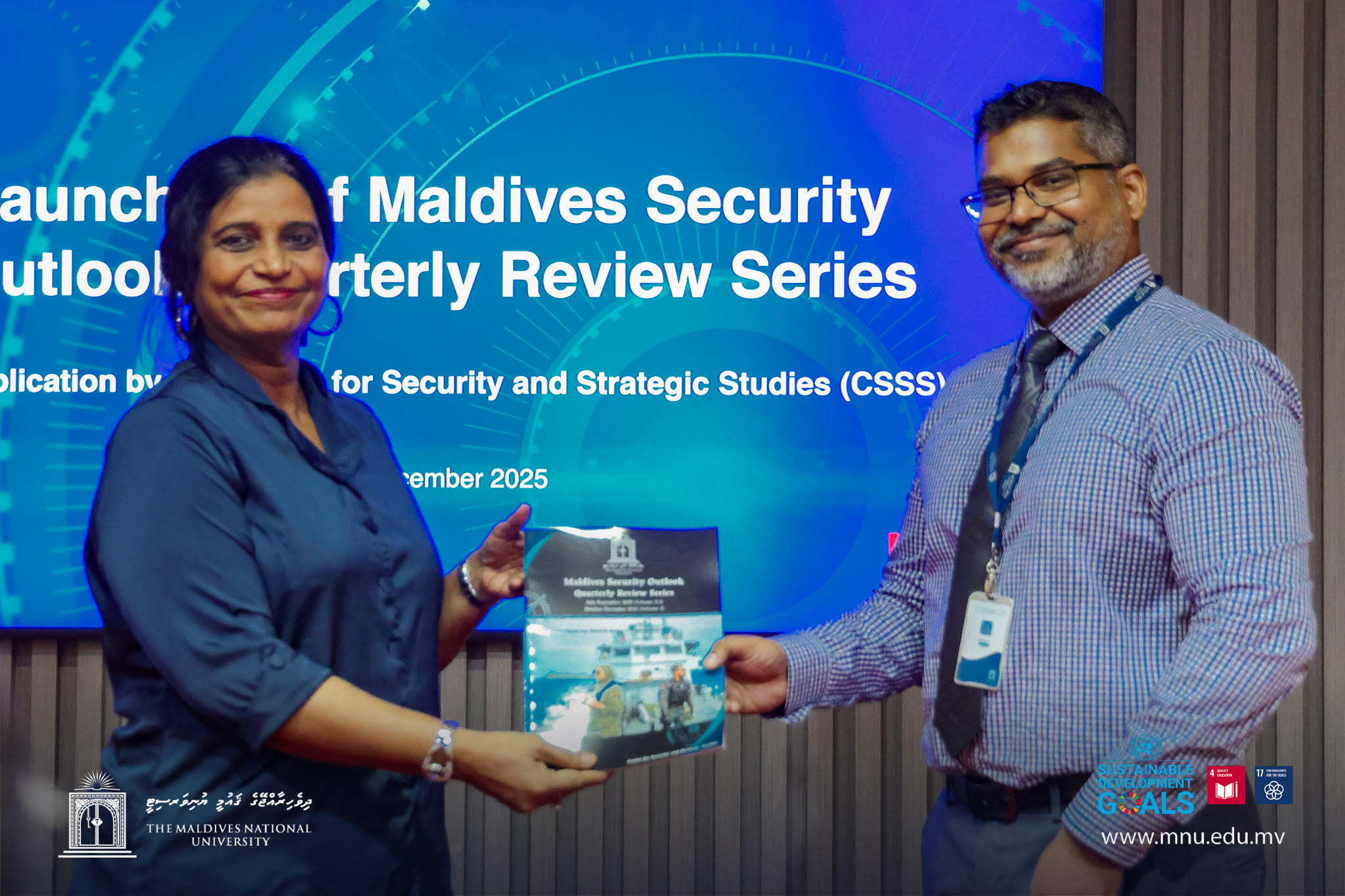 ދިވެހިރާއްޖޭގެ ޤައުމީ ޔުނިވަރސިޓީގެ ސެންޓަރ ފޯ ސެކިއުރިޓީ އެންޑް ސްޓްރެޓީޖިކް ސްޓަޑީޒް ސީއެސީއެސްއެސް އިން ތަރައްޤީކޮށްފައިވާ "މޯލްޑިވްސް ސެކިއުރިޓީ އައުޓްލުކް ކުއާޓަރލީ ރިވިއު ސީރީޒް (އެމްއެސްއޯ) ގެ ޗާޕުކުރެވިފައިވާ ފުރަތަމަ އެޑިޝަން މިއަދު އިފްތިތާޙު ކޮށްފިއެވެ.