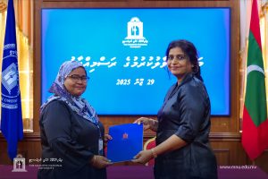 އެމްއެންޔޫގައި މިއަދު ހެނދުނު ބޭއްވި ރަސްމިއްޔާތުގައި މަޤާމުގެ ލިޔުން ނަހުޒާއާ ހަވާލުކޮށްދެއްވީ ޤައުމީ ޔުނިވަރސިޓީގެ ވައިސް ޗާންސެލަރު، ޑރ. އައިޝަތު ޝެހެނާޒު އާދަމެވެ.